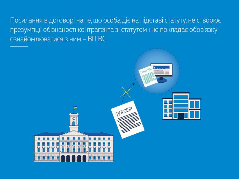 Велика Палата ВС дійшла висновку, що посилання в договорі на те, що особа діє на підставі статуту, не можна беззастережно ототожнювати з тим, що третя особа – контрагент ознайомилася зі статутом. Це посилання не презюмує, що третя особа ознайомлена зі статутом, і не покладає на неї в будь-якому разі обов’язки ознайомлюватися з ним. Питання про те, чи слід вважати особу такою, що знала чи мала знати про перешкоди законному укладенню договору, має вирішувати суд у конкретній справі залежно від її обставин та природи договору.
