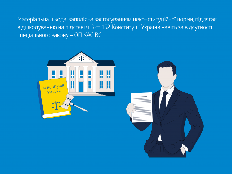Також Верховний Суд зауважив, що положення ч. 3 ст. 152 Конституції України містять посилання на спеціальний закон, а тому відшкодування шкоди, завданої актами і діями, які визнані неконституційними, не повинно здійснюватися в іншому, ніж у встановленому законом, порядку. Разом з тим закон, який би встановлював порядок відшкодування державою матеріальної чи моральної шкоди, завданої актами і діями, що визнані неконституційними, на час розгляду цієї справи, незважаючи на вимоги ст. 152 Конституції України, не прийнятий. Водночас держава повинна вживати заходів для поновлення визнаних нею і порушених з її вини прав, свобод та законних інтересів людини.